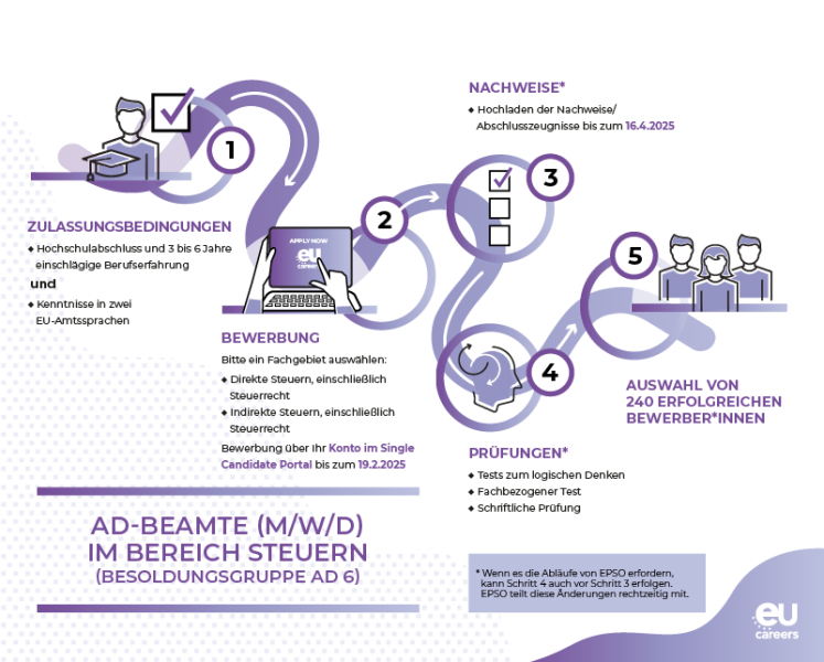 - Das Auswahlverfahren umfasst mehrere Phasen. Solange Datum und Uhrzeit nicht bestätigt sind, ist der angegebene Zeitplan als vorläufig zu betrachten.